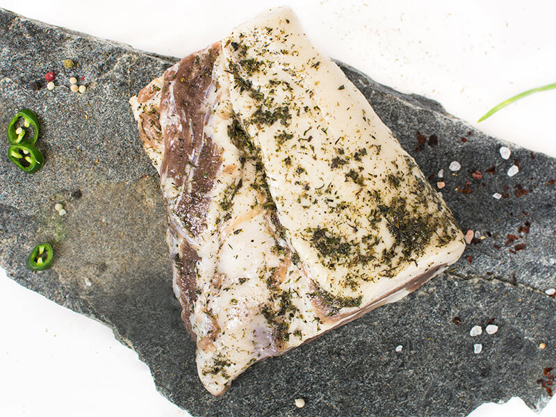Осоленият бекон е любим деликатес за вино. Сочна сланина с подправки. Опакован във вакуум.